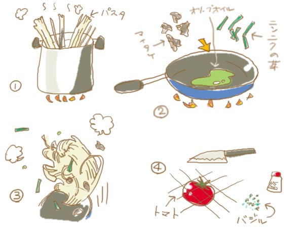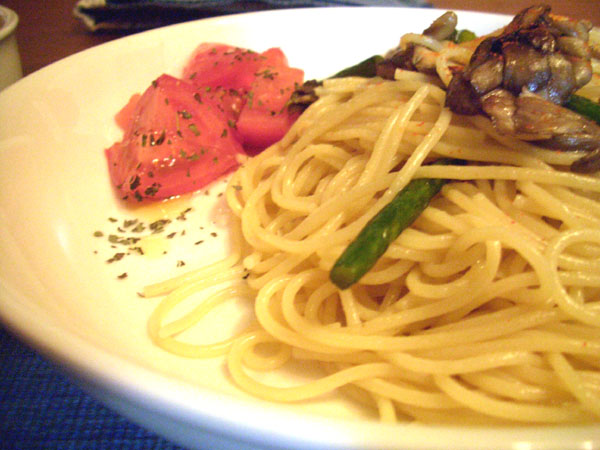 本来なら、ここでニンニクと唐辛子を入れて火にかけ、オイルに香りと味をうつすんですが、ニンニクは次の日も用事があるのでパスして、ニンニクの芽で香り付けを兼ねます。唐辛子もめんどくさいのでパス。