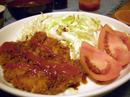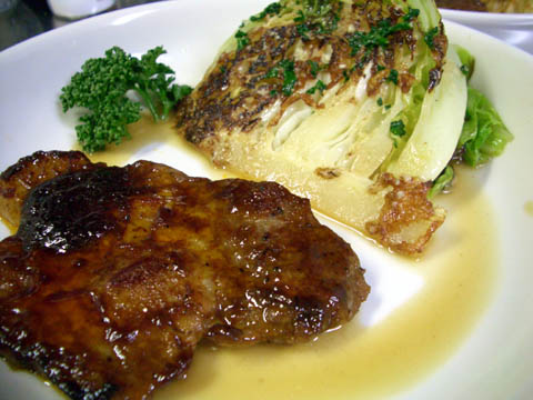 ポークチョップは、軽く塩コショウをして、両面を焼き、蓋をして弱火でじっくり火を通したら、ケチャップとウスターソースをかけて軽く火を通せば完成です。いつもは裏面を焼くときに玉ねぎのスライスを入れるんですが、今日は初めてのキャベツステーキに頭がいってて忘れちゃいました。